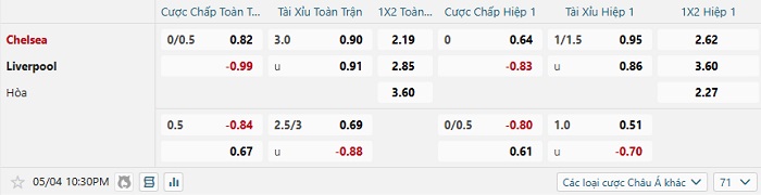 Tip kèo Châu Á hiệp 1 Chelsea vs Liverpool