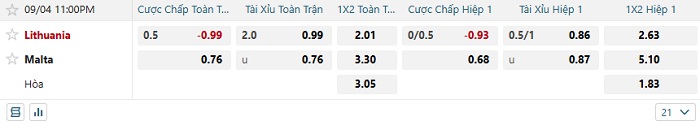 - Dự đoán tỷ số hiệp 1: Lithuania 1 – 0 Malta