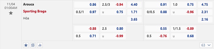 Tip kèo Châu Á full trận Arouca vs Braga