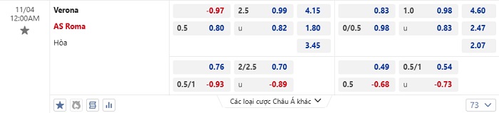 Tip kèo Châu Á full trận Verona vs AS Roma