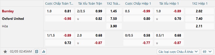 Tip kèo Châu Á hiệp 1 Burnley vs Oxford United