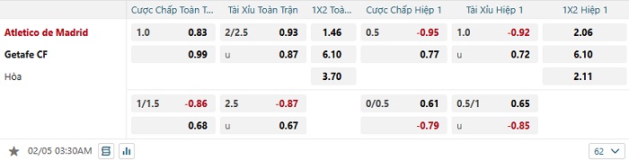 Tip kèo Châu Á hiệp 1 Atletico Madrid vs Getafe