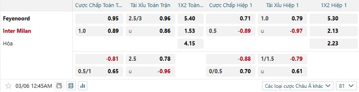 Tip kèo Châu Á full trận Feyenoord vs Inter Milan
