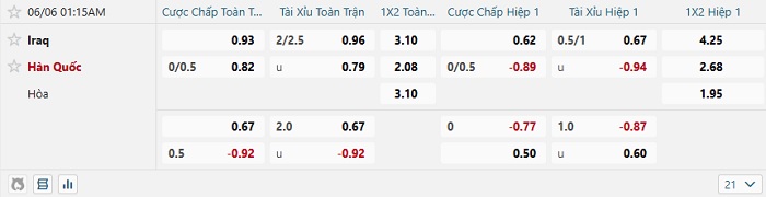 - Dự đoán tỷ số hiệp 1: Iraq 0 – 0 Hàn Quốc