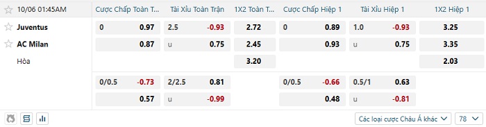 Tip kèo Châu Á full trận Juventus vs AC Milan