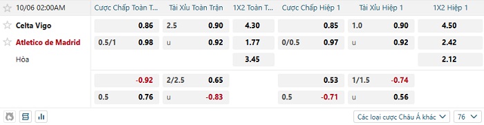 Tip kèo Châu Á full trận Celta Vigo vs Atletico Madrid