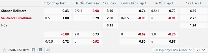 Tip kèo Châu Á full trận Shonan Bellmare vs Sanfreece Hiroshima