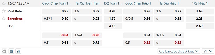 Tip kèo Châu Á full trận Real Betis vs Barcelona