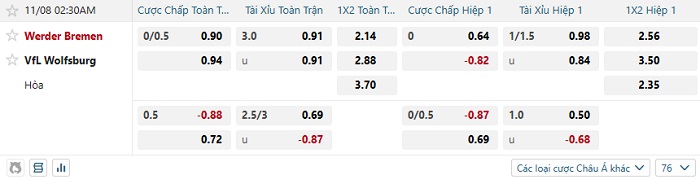 Tip kèo Châu Á hiệp 1 Werder Bremen vs Wolfsburg