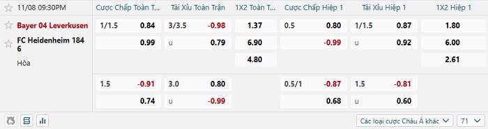 Tip kèo Châu Á hiệp 1 Beyer Leverkusen vs Heidenheim