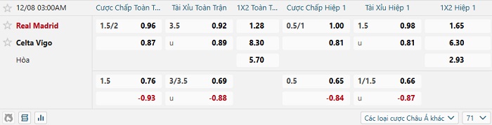 Tip kèo Châu Á hiệp 1 Real Madrid vs Celta Vigo
