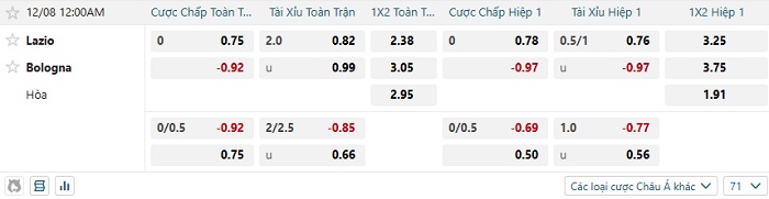 Tip kèo Châu Á hiệp 1 Lazio vs Bologna