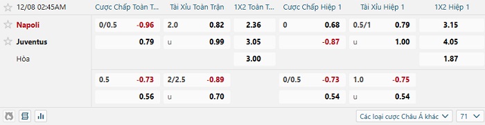 Tip kèo Châu Á full trận Napoli vs Juventus