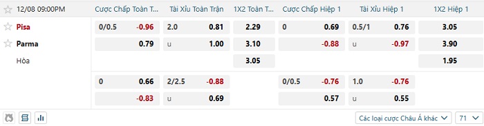 Tip kèo Châu Á hiệp 1 Pisa vs Parma