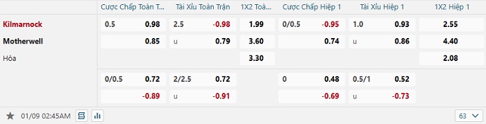 Tip kèo Châu Á hiệp 1 Kilmarnock vs Motherwell