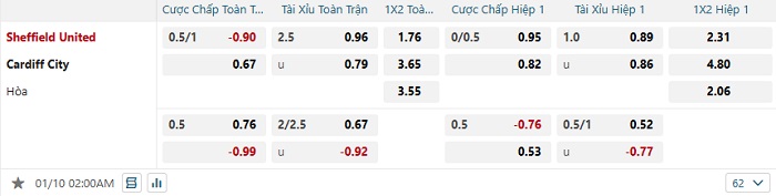 Tip kèo Châu Á hiệp 1 Sheffield vs Cardiff