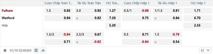 Tip kèo Châu Á hiệp 1 Fulham vs Watford