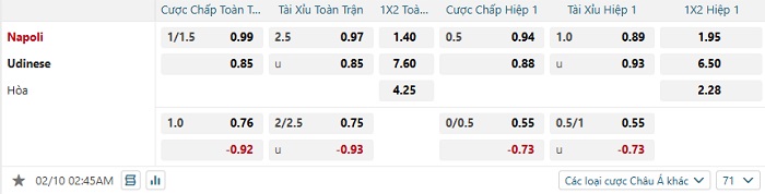 Tip kèo Châu Á full trận Napoli vs Udinese