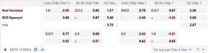 Tip kèo Châu Á hiệp 1 Real Sociedad vs Espanyol