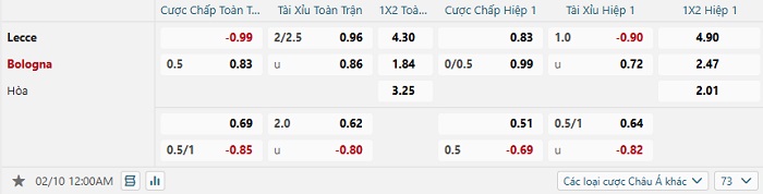 Tip kèo Châu Á hiệp 1 Lecce vs Bologna