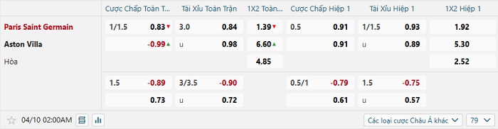Tip kèo Châu Á hiệp 1 PSG vs Aston Villa