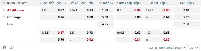Tip kèo Châu Á hiệp 1 AZ Alkmaar vs Groningen