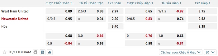 Tip kèo Châu Á hiệp 1 West Ham vs Newcastle