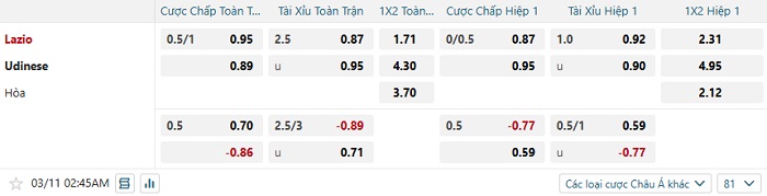 Tip kèo Châu Á hiệp 1 Lazio vs Udinese