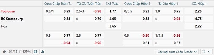 Tip kèo Châu Á hiệp 1 Toulouse vs Strasbourg