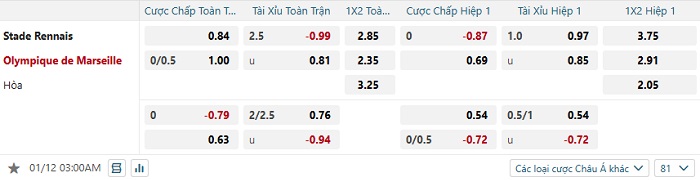 Tip kèo Châu Á hiệp 1 Rennes vs Marseille