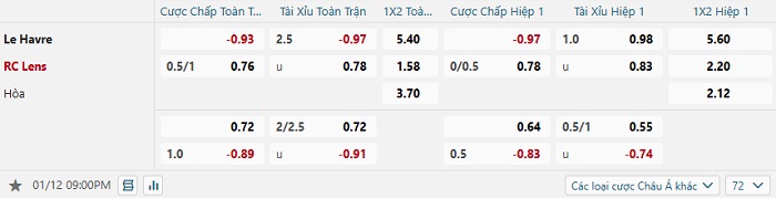 Tip kèo Châu Á hiệp 1 Le Havre vs Lens