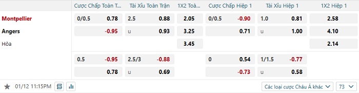 Tip kèo Châu Á hiệp 1 Montpellier vs Angers