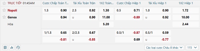 Tip kèo Châu Á hiệp 1 Napoli vs Genoa