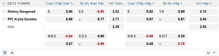 Tip kèo Châu Á hiệp 1 Nizzhny Novgorod vs PFC Krylia
