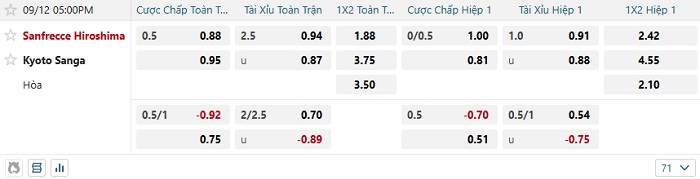 - Dự đoán tỷ số hiệp 1: San. Hiroshima 0 – 0 Kyoto Sanga