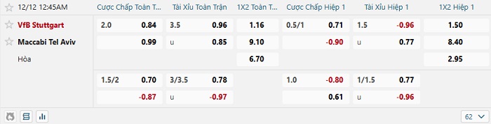 Tip kèo Châu Á hiệp 1 Stuttgart vs Tel Aviv