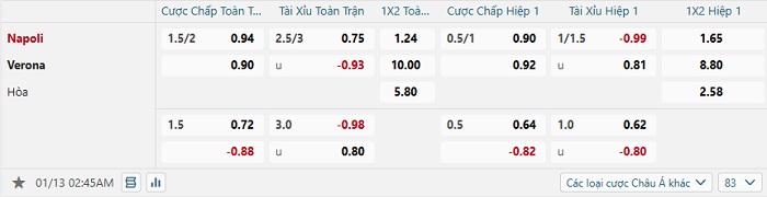Tip kèo Châu Á hiệp 1 Napoli vs Verona