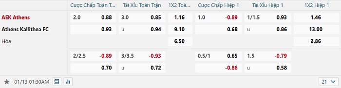 Tip kèo Châu Á hiệp 1 AEK Athens vs Kallithea