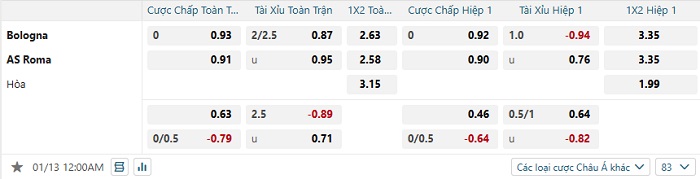 Tip kèo Châu Á hiệp 1 Bologna vs Roma