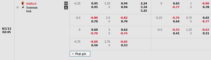 Tip kèo Châu Á full trận Watford vs Swansea