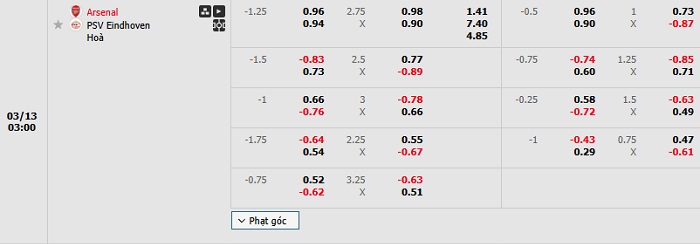 Tip kèo Châu Á full trận Arsenal vs PSV