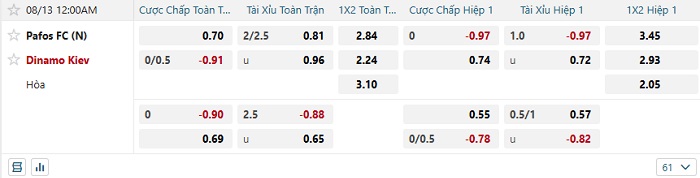 Tip kèo Châu Á full trận Pafos vs Dinamo Kiev