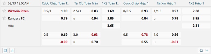 Tip kèo Châu Á full trận Viktoria Plzen vs Rangers