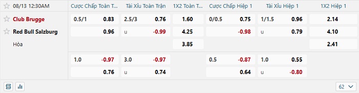 • Dự đoán tỷ số hiệp 1: Club Brugge 1 – 0 Salzburg