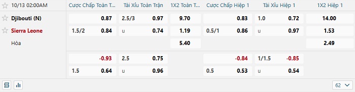 Tip kèo Châu Á hiệp 1 Djibouti vs Sierra Leone