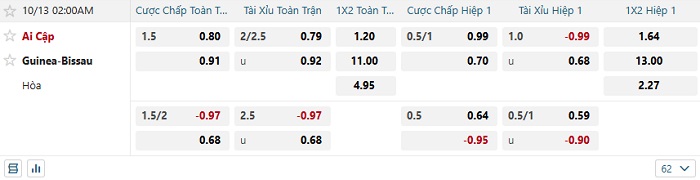 Tip kèo Châu Á hiệp 1 Ai Cập vs Guinea Bissau