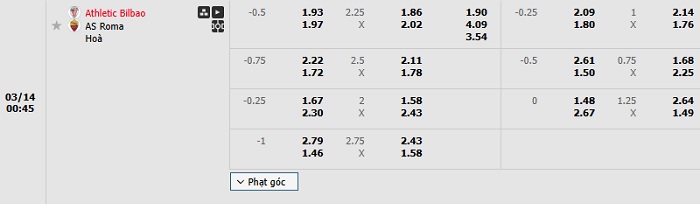 Tip kèo Châu Á full trận Bilbao vs Roma