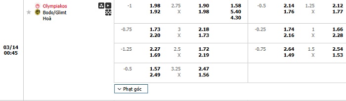 Tip kèo Châu Á full trận Olympiakos vs Bodo
