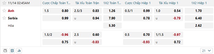 Tip kèo Châu Á full trận Anh vs Serbia