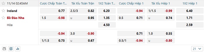 Tip kèo Châu Á full trận Ireland vs Bồ Đào Nha